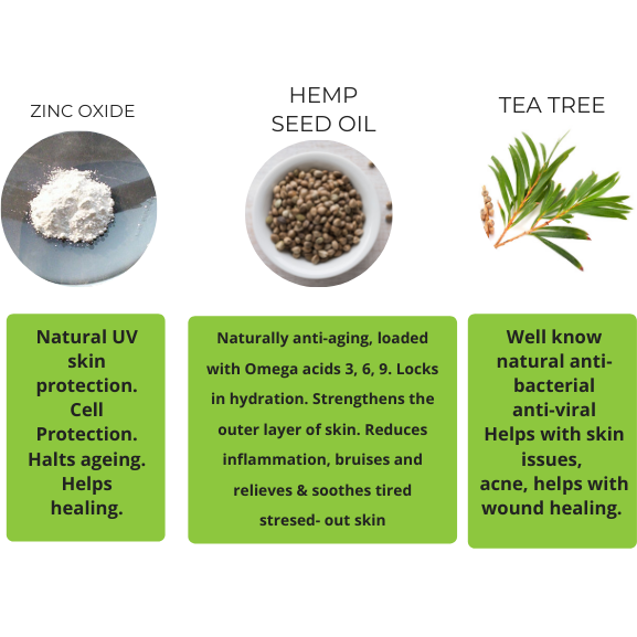 Natural skin loving ingredients: Sugar, Sea Salt, Beeswax, Helianthus annuus (Organic Sunflower) Seed Oil, Cocos nucifera (Coconut) Oil, Butyrospermum parkii (Shea) Butter, Ricinus communis (Castor Oil), Olea europaea (Olive Oil),  Hemp Seed Oil, Moroccan Argan Oil, Raw Honey, Persea gratissima (Avocado Oil), Tocopherol (Vitamin E) Oil, Ethylhexylglycerin, Phenoxyethanol, Fragrance